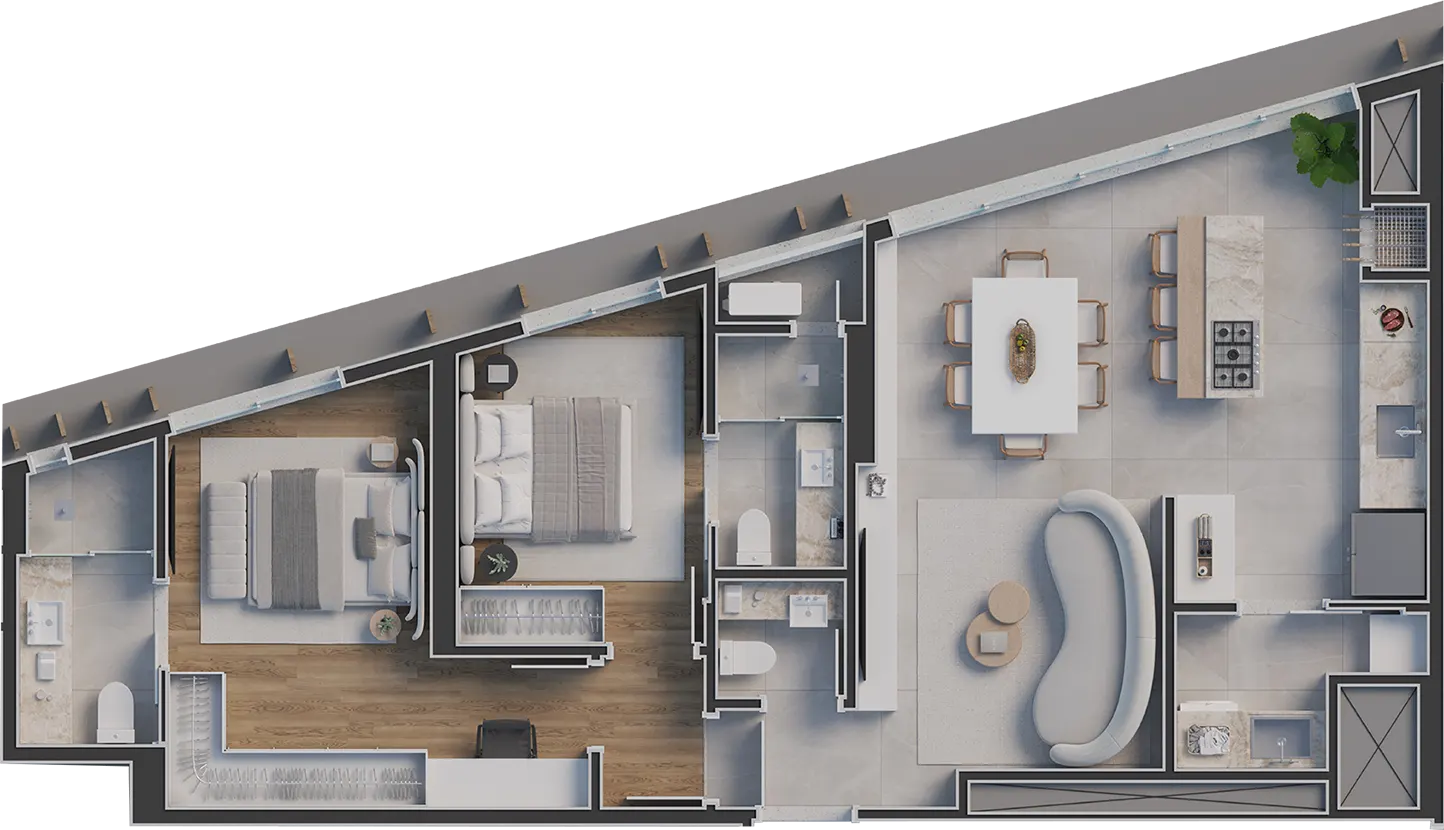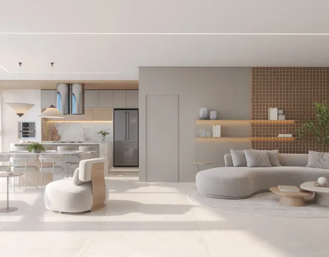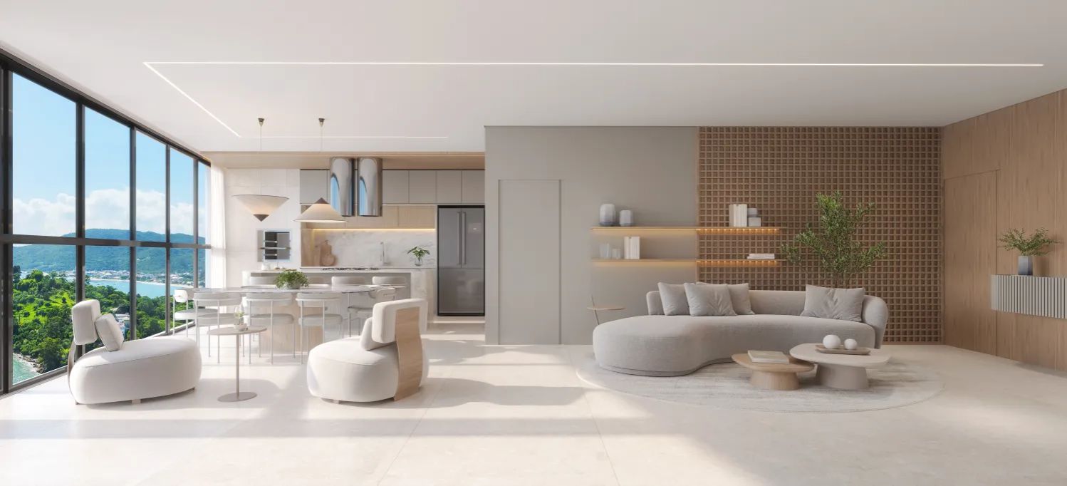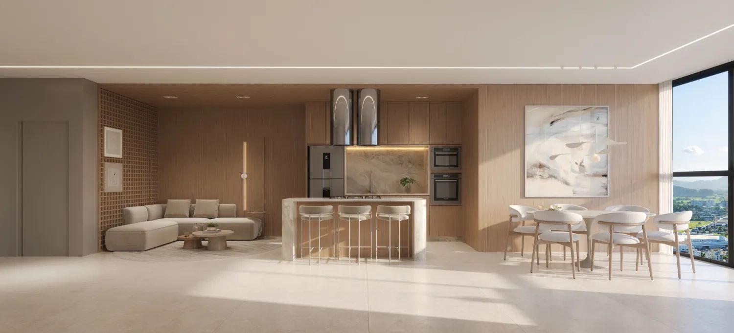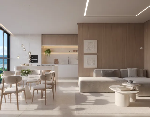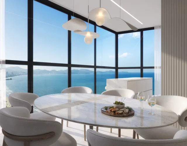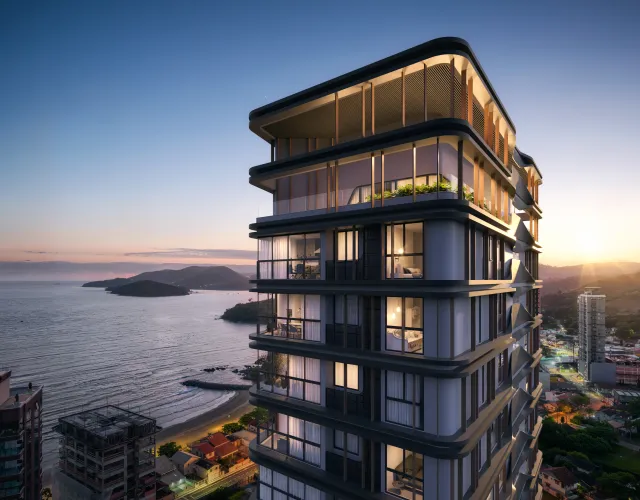Apenas 72 residências exclusivas que fluem entre 2 e 3 suítes, com áreas que variam de 82 a 131 m². Cada apartamento é entregue com sacadas envidraçadas que integram o mar à sua rotina, transformando a vista em parte da decoração. Aqui, os espaços respiram com você - ambientes pensados para se adaptar aos seus momentos, onde a luz natural esculpe cada ambiente e o horizonte se torna extensão do seu lar.