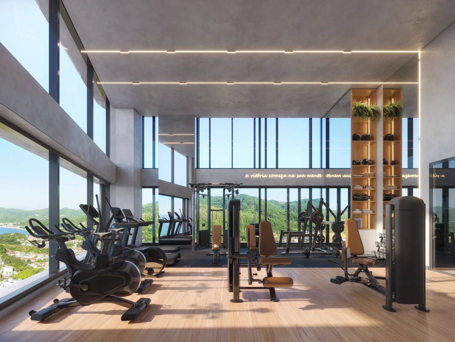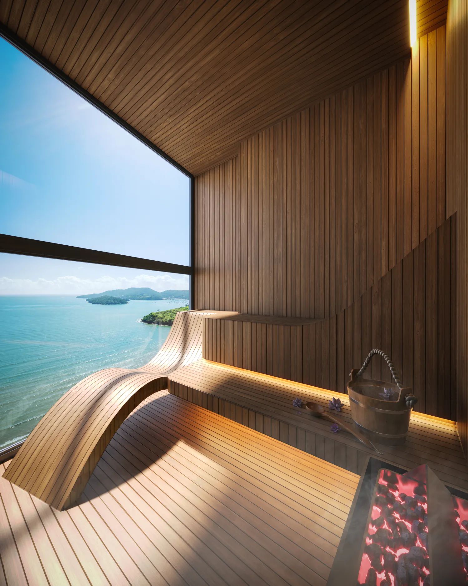 No topo do edifício, a 104 metros de altura, o Wellness ganha nova dimensão. O Rooftop combina academia, spa, saunas, salas de yoga e espaços de meditação em 377 m² suspensos entre céu e mar. É o primeiro da região a oferecer um conceito de bem-estar integral completo no último pavimento, onde cuidar de si mesmo se torna um ritual com vista infinita para o horizonte.